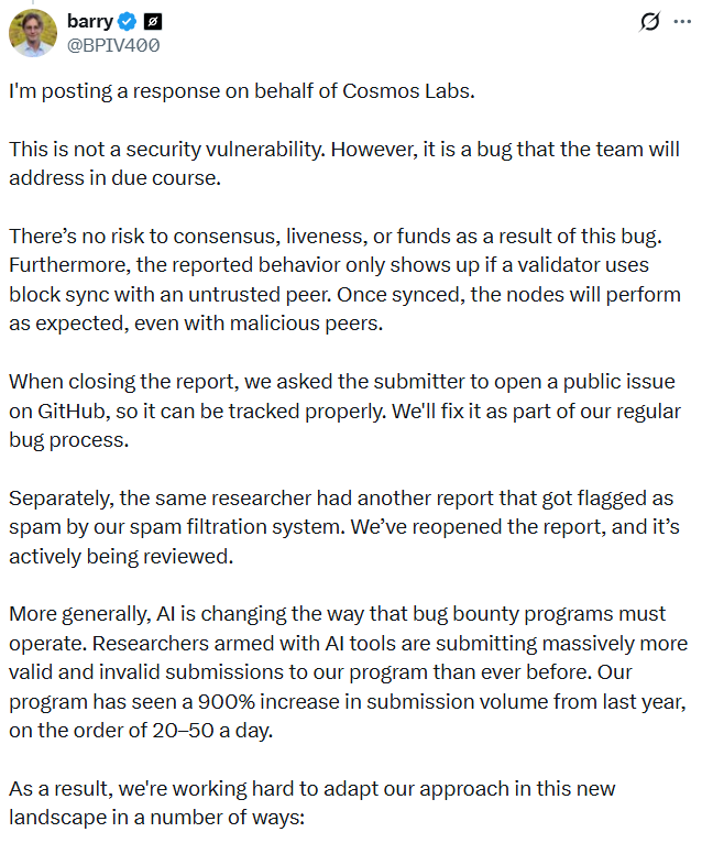 “AI is changing the way that bug bounty programs must operate,” stated Barry Plunkett, co-CEO of Cosmos Labs, on Tuesday, responding to a bug bounty hunter who accused the protocol of ignoring their vulnerability report.