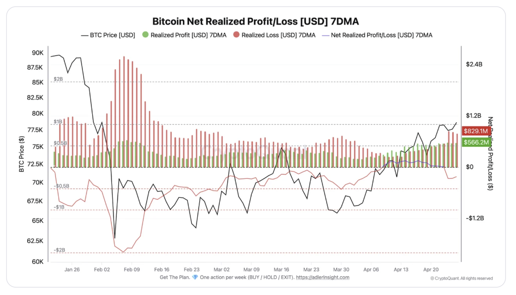 Onchain data adds to this view. Crypto analyst Darkfost pointed out that the weekly realized losses reached $829 million on a seven-day average, compared to $566 million in realized profits. The net realized profit briefly turned positive on April 9, then reversed within two weeks.