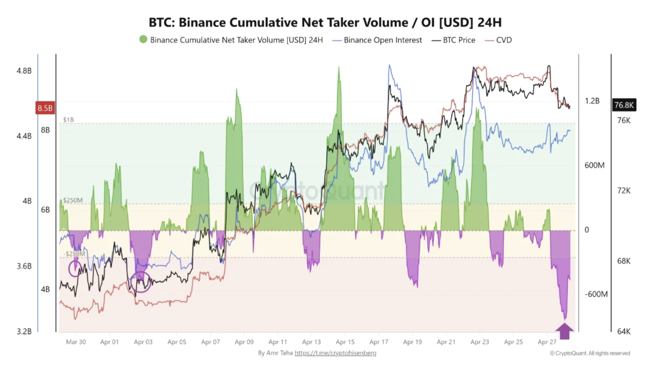 Derivatives data shows strong sell-side activity on Binance. Crypto analyst Amr Taha pointed out that the 24-hour cumulative net taker volume dropped by $828 million on April 27, the lowest reading since late March.
