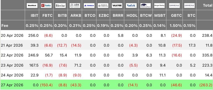 As Bitcoin failed to reclaim $80,000, US spot Bitcoin ETFs posted $263 million in outflows, ending a nine-day inflow streak. This decline in investor interest comes as Bitcoin slipped below $77,000. The outflows mark a significant change in investor sentiment, which had been bullish over the past nine days.