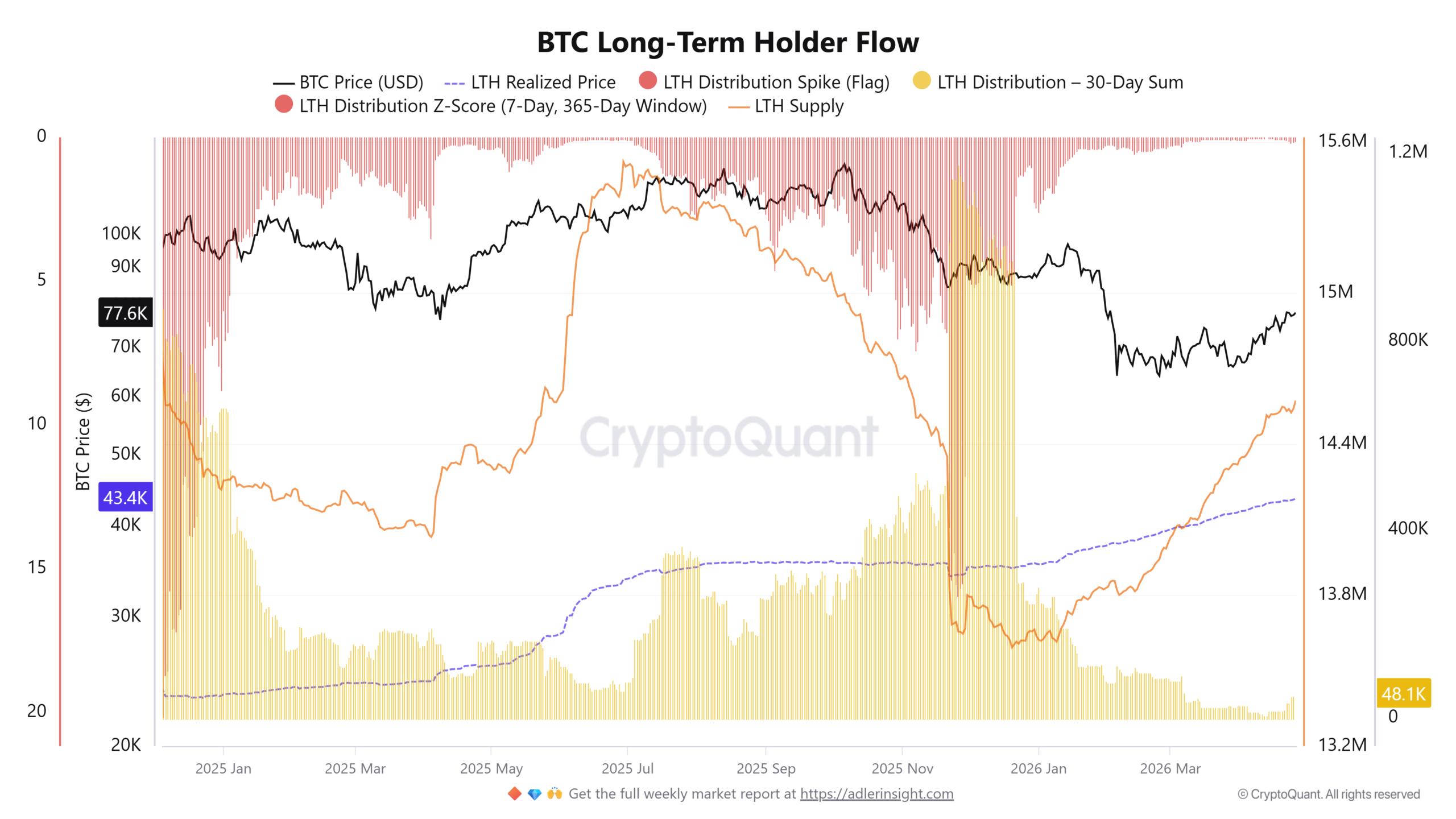 The long-term holders (LTHs) continue to absorb supply at a steady pace. LTHs’ balance has reached 14.57 million BTC, aligning with the prior accumulation peaks. The distribution activity was 42,100 BTC sold over the past 30 days, one of the lowest readings in 2026.
