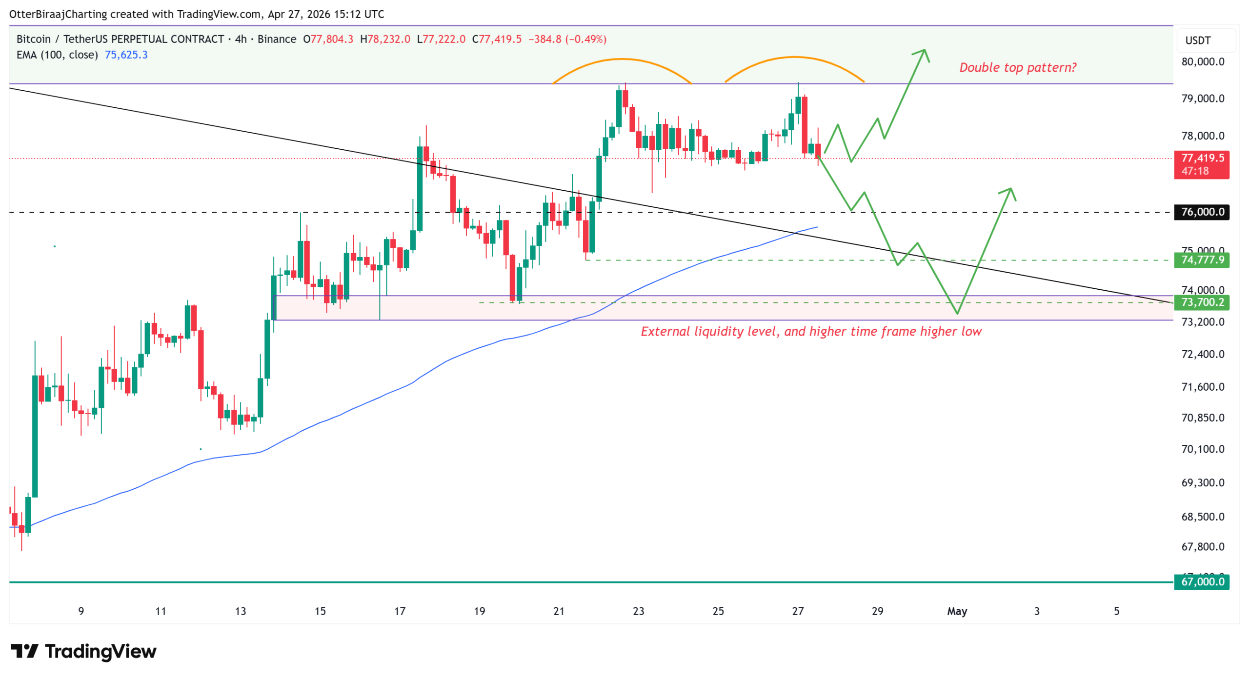 Currently at $77,731, the price may rotate toward liquidity pockets near $74,700 and $73,700.