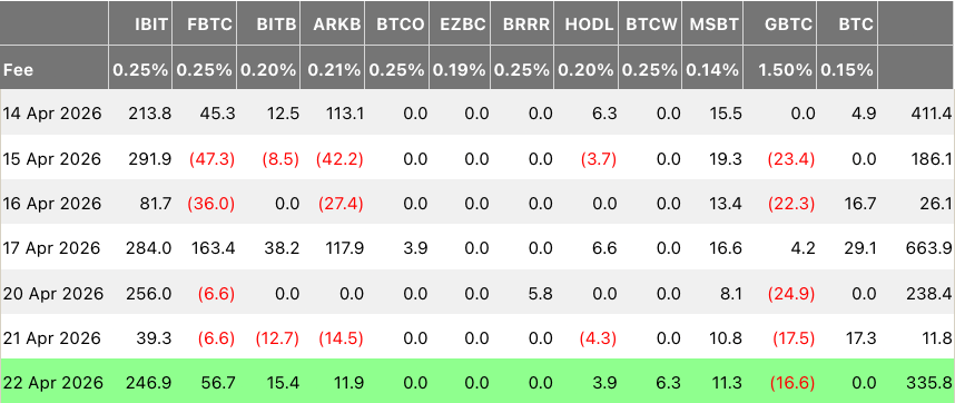Daily spot Bitcoin ETF inflows since April 14. Source: Farside.co.uk
