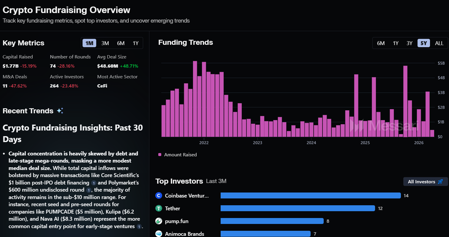 “While total capital inflows were bolstered by massive transactions like Core Scientific’s $1 billion post-IPO debt financing and Polymarket’s $600 million undisclosed round, the majority of activity remains in the sub-$10 million range,” they added.