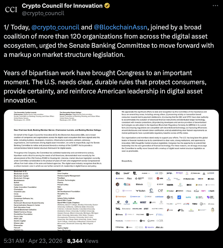 “We are now more than halfway through the 119th Congress, and it has been more than 270 days since the House passed the CLARITY Act with strong bipartisan support and we recognize the legislative window for this Congress is narrowing.”