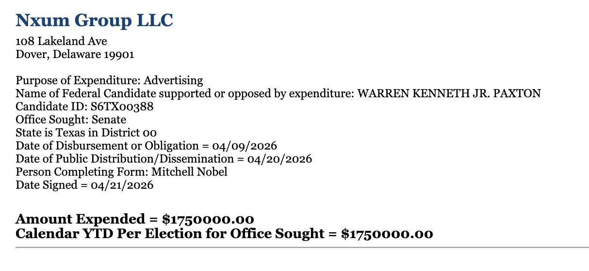 In a Tuesday filing with the US Federal Election Commission (FEC), Fellowship PAC disclosed that it had spent $1.75 million in support of Texas Attorney General Ken Paxton. The Republican is facing off against incumbent Senator John Cornyn in a May 26 runoff to determine who will become the party’s candidate for the 2026 US Senate race.