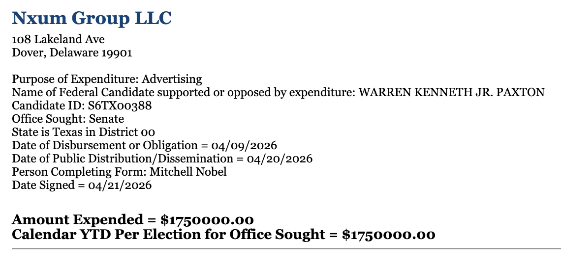 Fellowship PAC expenditure report on Ken Paxton. Source: FEC