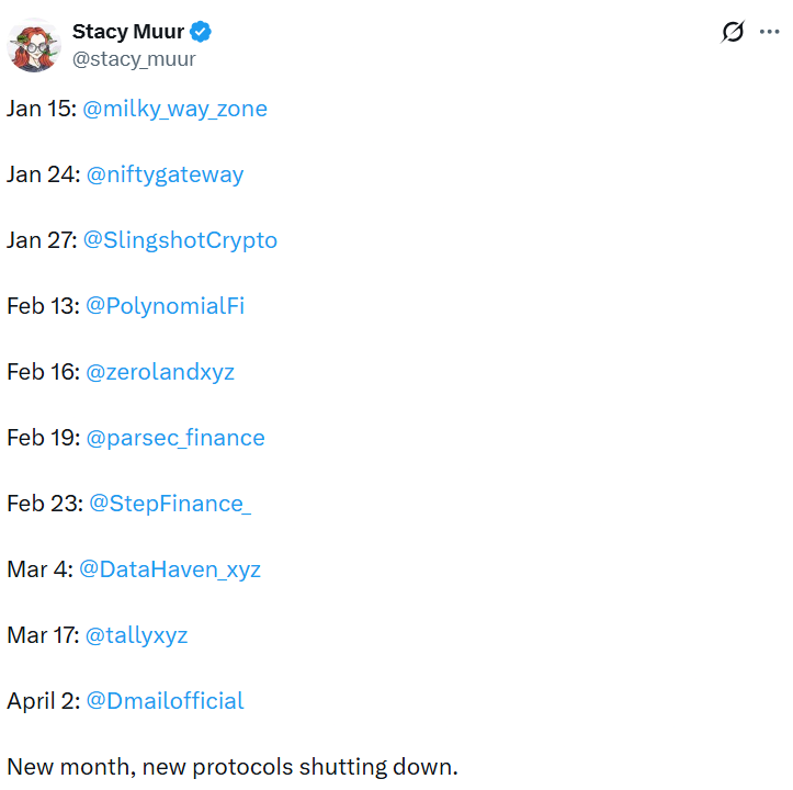 Each month in 2026 had a crypto project announcing shutdowns. Source: Stacy Muur