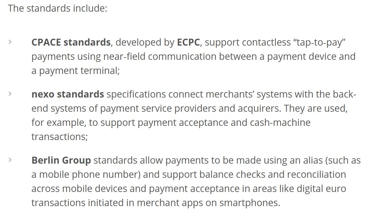 as reported by the ECB, the agreements with the European Card Payment Cooperation, Nexo standards and the Berlin Group will allow the ECB to utilize standards covering contactless tap-to-pay payments, merchant-to-payment-provider connections and alias-based payments, such as transactions using a mobile phone number.