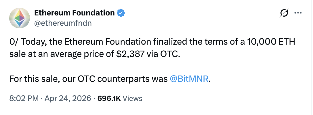 - The Ethereum Foundation has sold approximately 20,000 ETH so far in 2026.