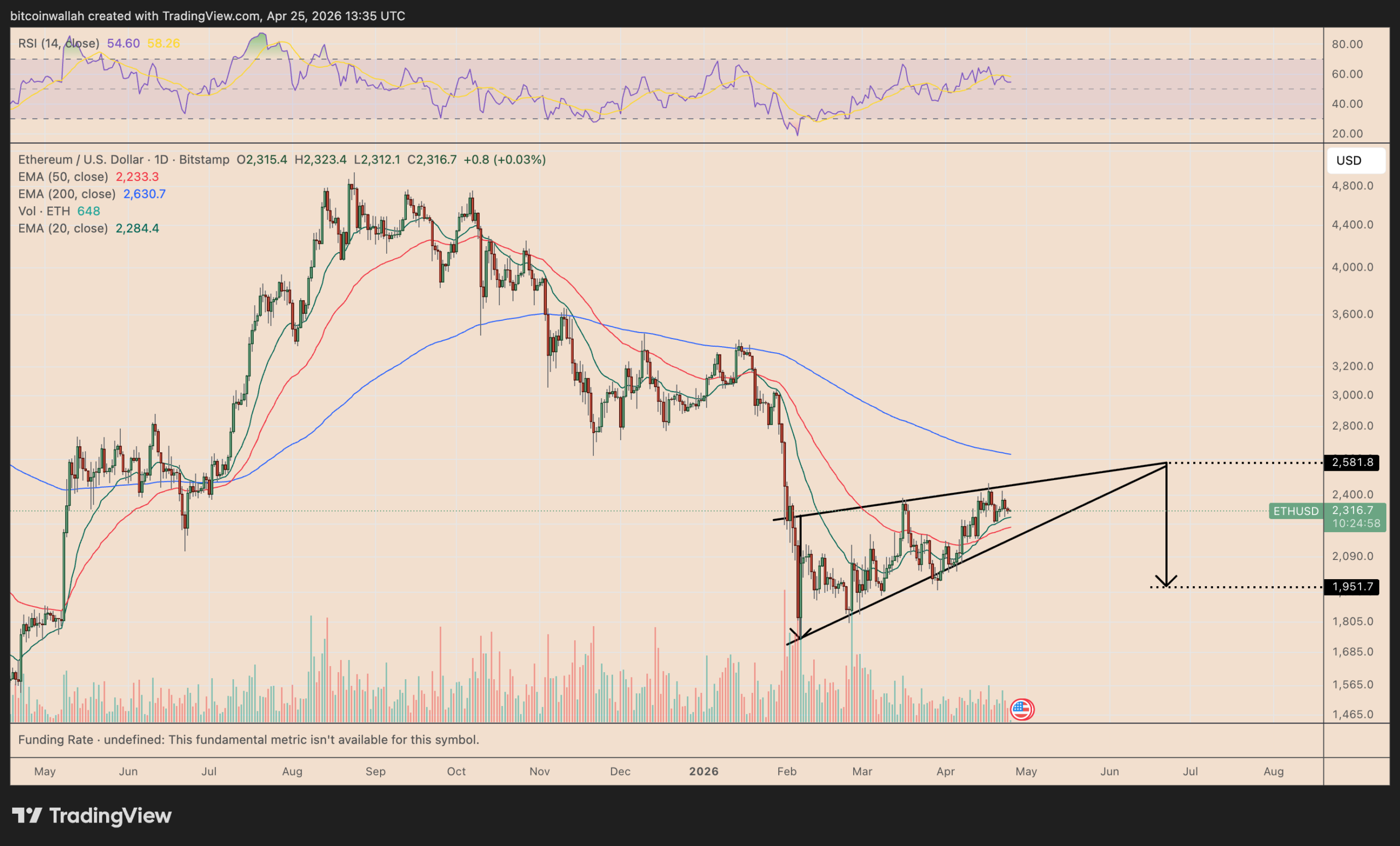 From a technical perspective, Ether is currently forming a rising wedge pattern, a structure defined by two ascending trend lines that are converging, accompanied by noticeably declining volume.