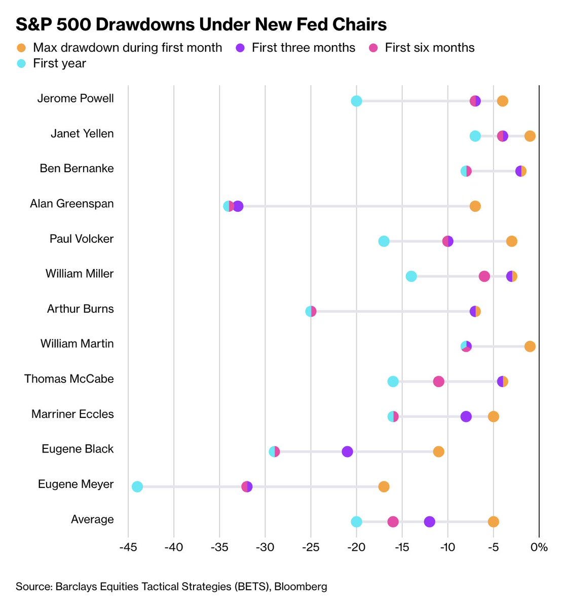 An accompanying chart put the average S&P 500 drawdown in the year a new Fed chair takes over at 20%.