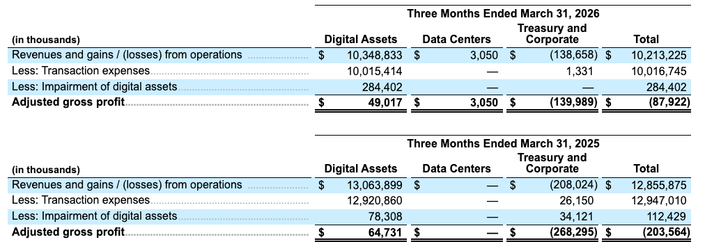 The company stated crypto market capitalization fell roughly 20% over the quarter, contributing to weaker asset valuations.
