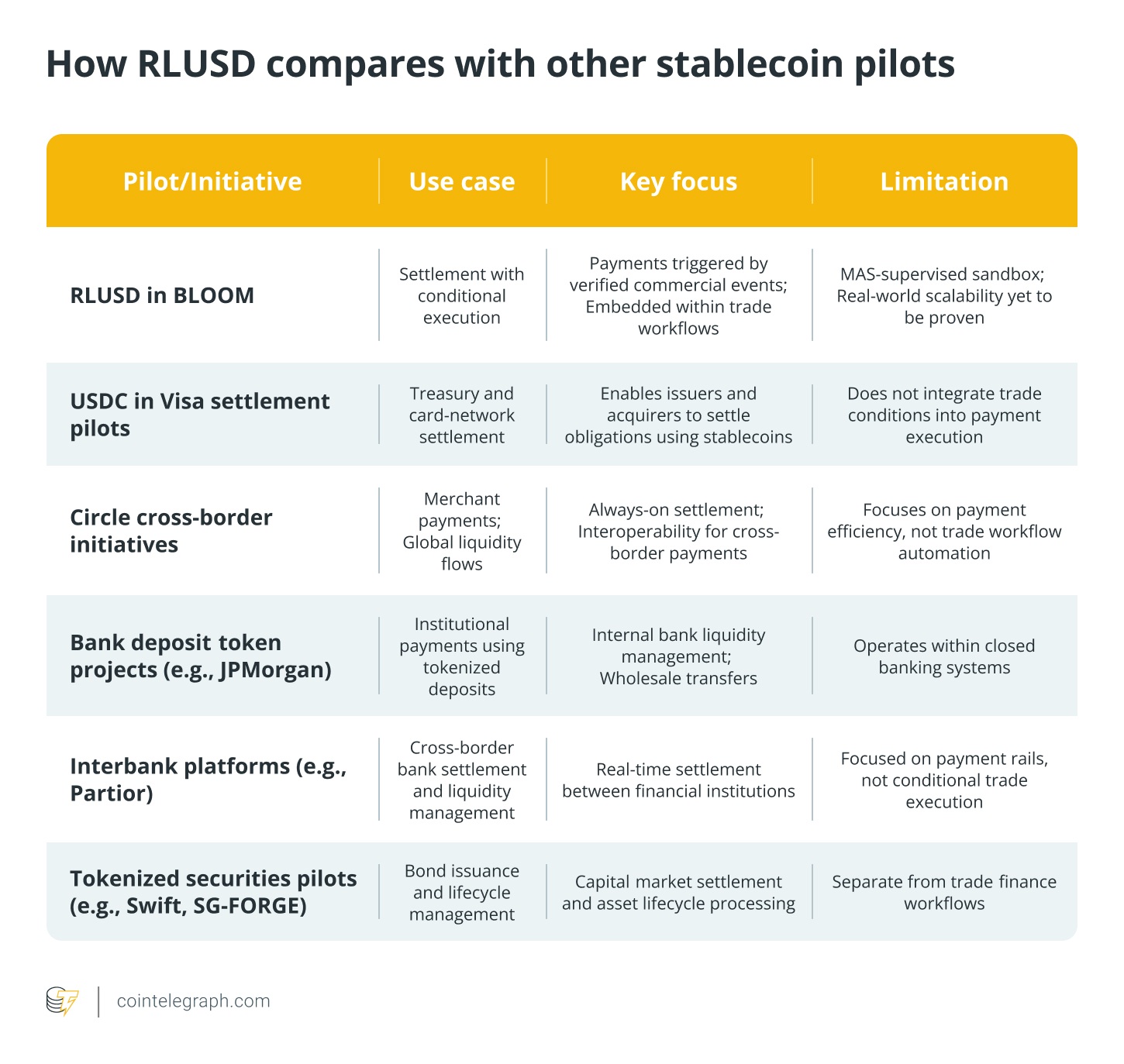 Ripple’s approach differs from other stablecoin and tokenized money experiments in several important ways. The pilot embeds settlement directly into trade finance processes, reducing fragmentation across documentation, financing, and payment. The use of conditional settlement logic adds a layer of programmability that extends well beyond basic transfers. The multi-asset environment, where RLUSD is being evaluated alongside tokenized bank liabilities, aligns with MAS’ broader objective of creating interoperable settlement assets.
