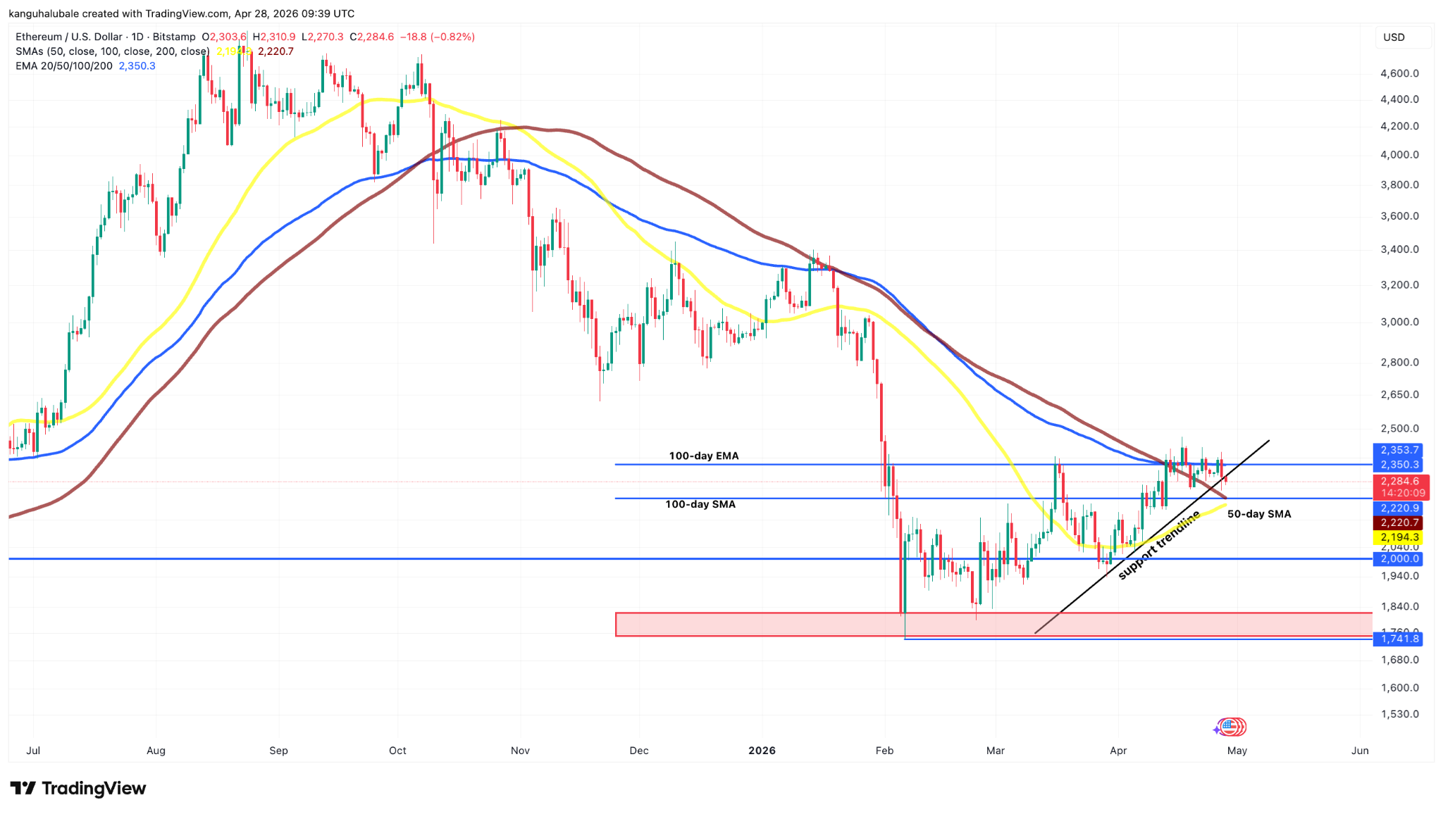 This meant that the price remained wedged between the 100-day exponential moving average at $2,350 and the 100-day simple moving average (SMA) at $2,220, as shown in the chart below.