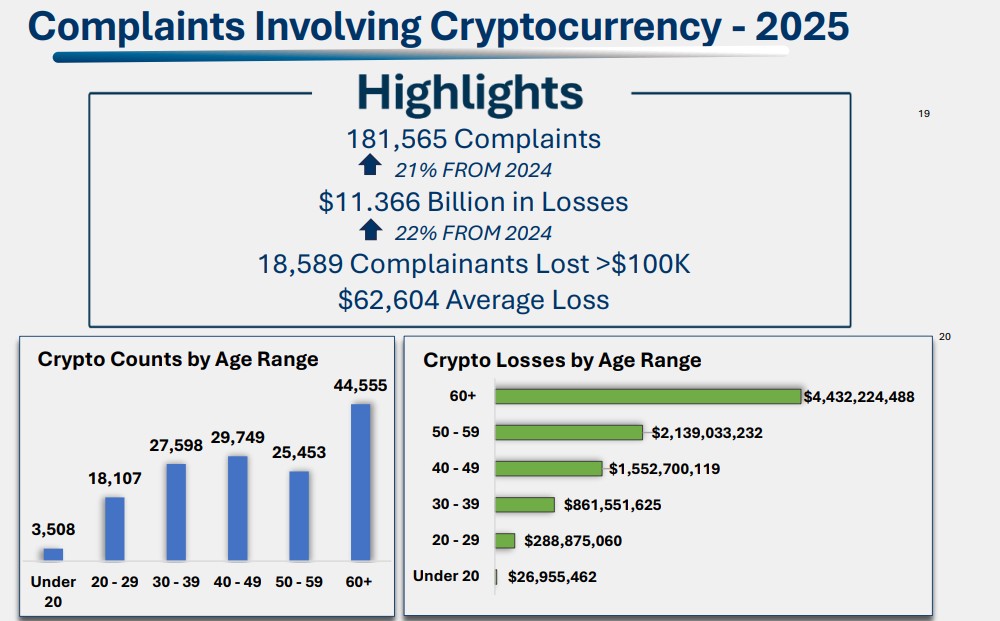 Cryptocurrency cases were linked to 181,565 complaints in 2025, resulting in $11.37 billion in losses, more than half of the total.