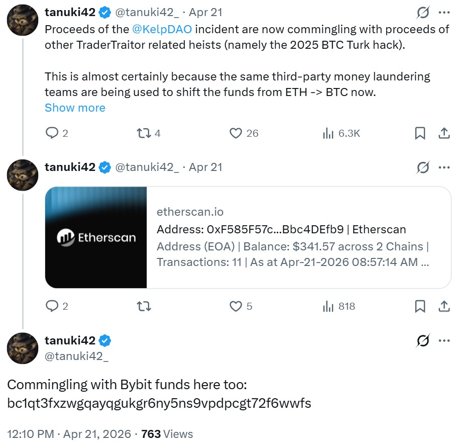 Blockchain investigator Tanuki42’s findings also found ties to TraderTraitor. Tanuki42 stated Tuesday that funds stolen from the Kelp DAO incident have commingled with previous exploits linked to the same group.