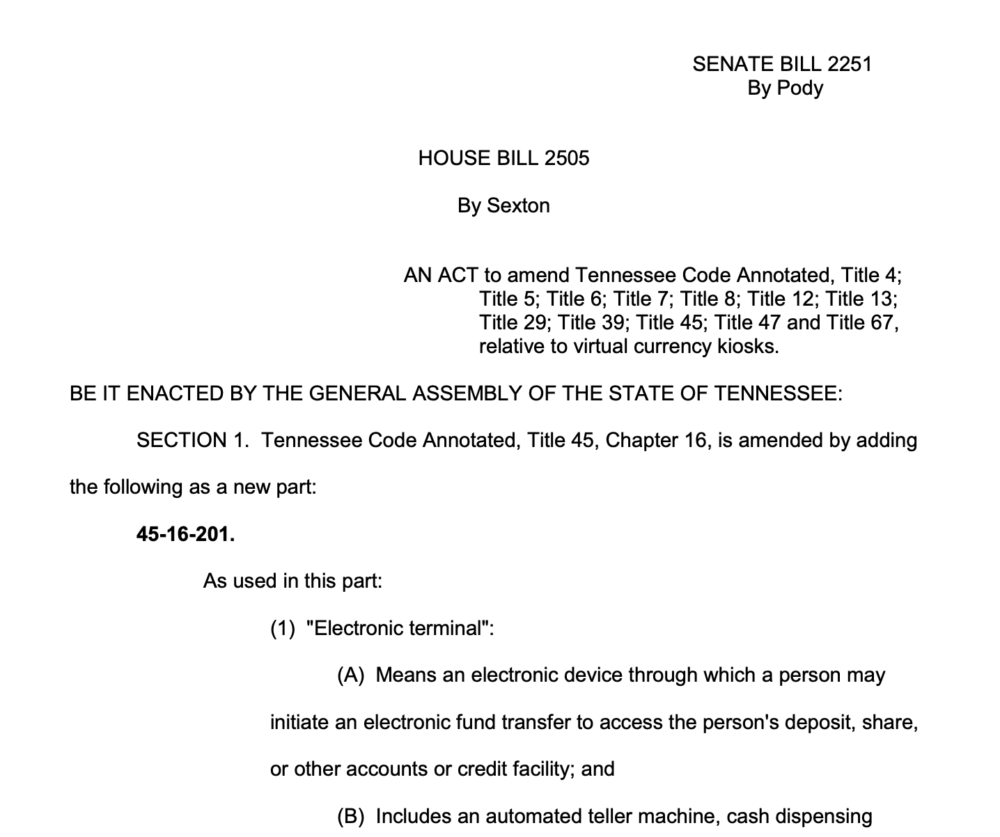 Tennessee Governor Bill Lee has signed a bill into law that will officially ban the utilize and installation of cryptocurrency ATMs and kiosks in the southeastern US state, leaving only a matter of weeks for companies to be in compliance.