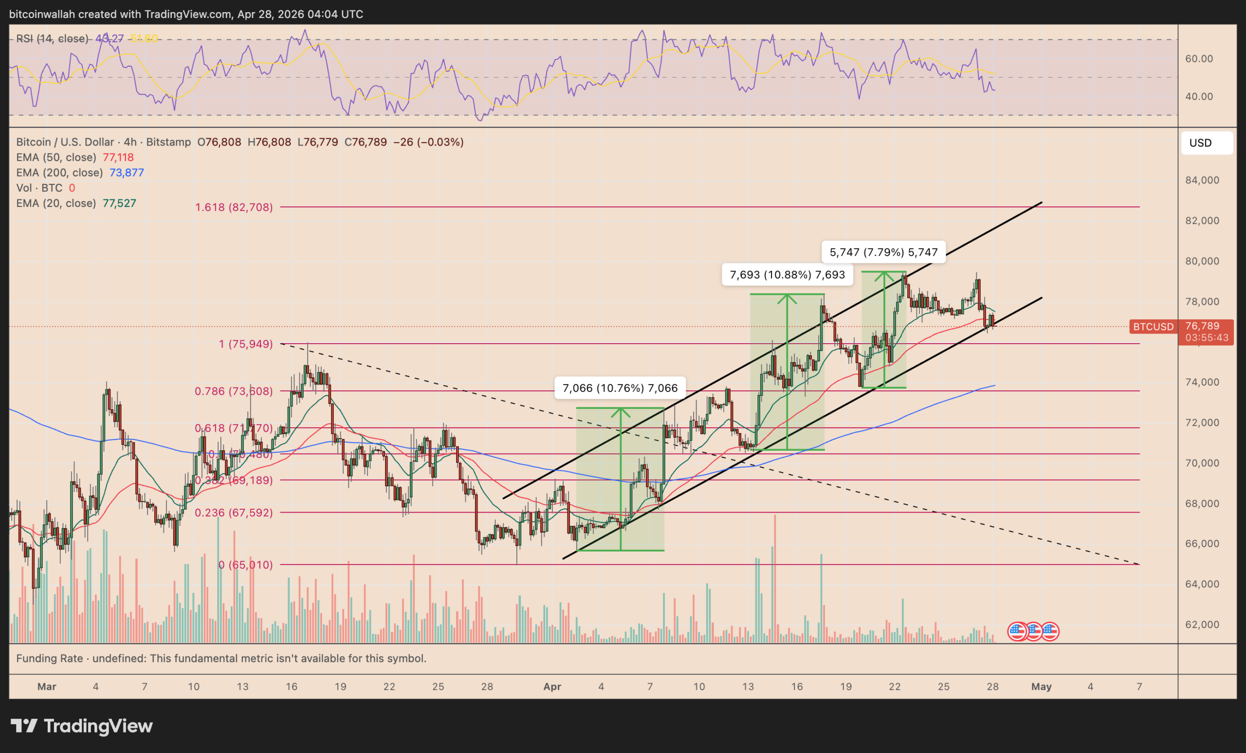 BTC is now consolidating near the channel’s lower support zone around $76,800–$77,500, which also coincides with the 20-period (green) and 50-period EMAs (red) on the 4-hour chart, a key dynamic support level in ongoing uptrends.