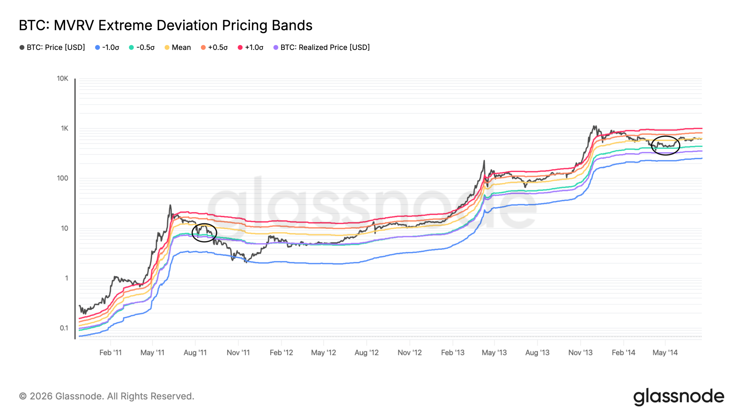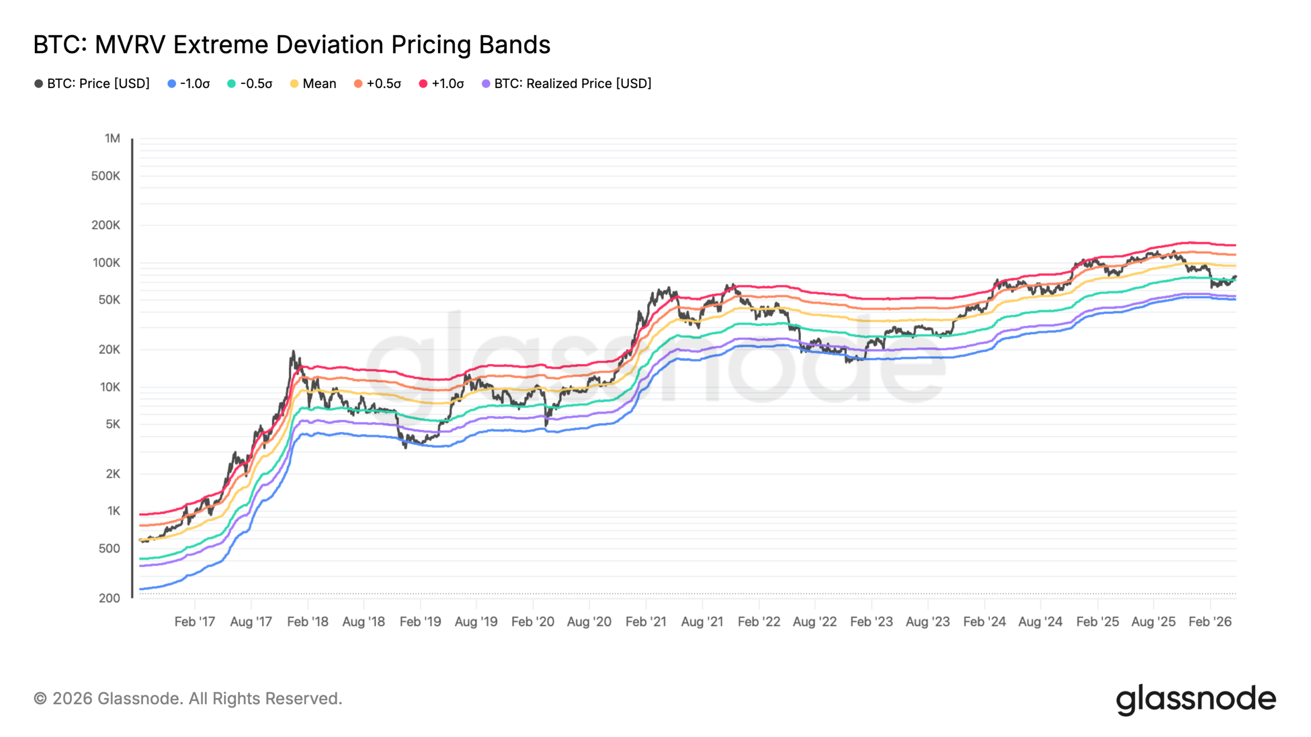 BTC MVRV Extreme Deviation Pricing Bands vs. price. Source: Glassnode